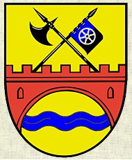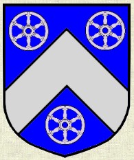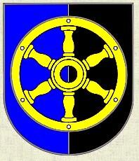 gespalten, darauf ein silbernes Rad mit 6 Speichen).